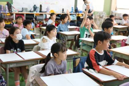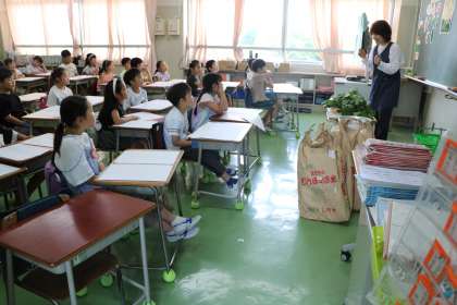 栄養士の先生が、枝豆の話をしてくれました。緑色の枝豆は、そのまま乾燥して茶色くなると・・・・などなど。2年生の子どもたちも知っていること、初めて知ることに興味津々です。