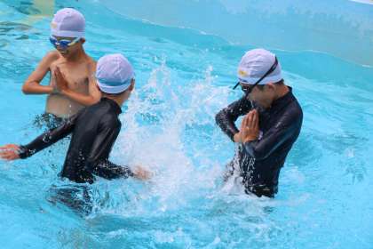 バディーのペアで水かけ遊びもしました。かけられる方はお地蔵様のように動いてはいけません。笛が鳴ったらかける人とかけられる人、交代します。
