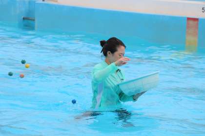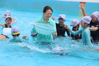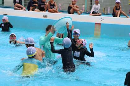 宝集めもしました。先生がプールに撒いた宝をみんなで力を合わせて集めます。