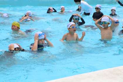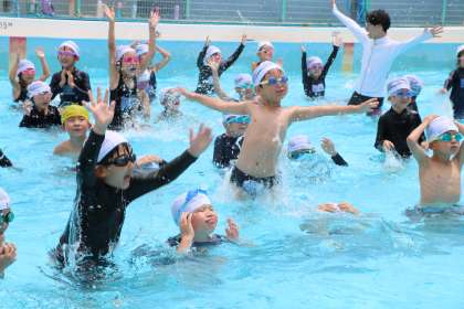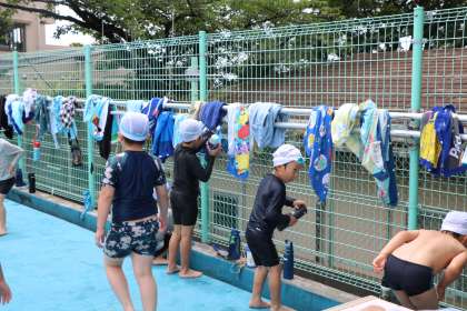 途中プールサイドに上がったタイミングで水分補給も忘れません。