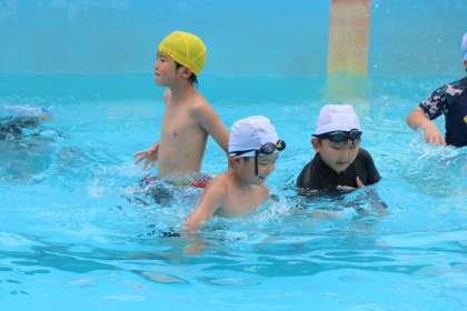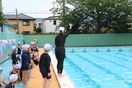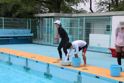 最後は男女対抗宝探しを全員でします。先生が宝を投げ入れるところをよく見ています。