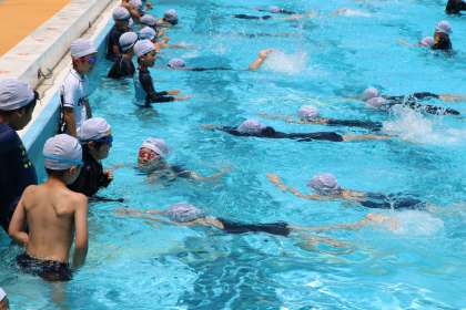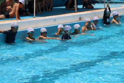 中学年の水泳運動は「浮いて進む運動」や「もぐる・浮く運動」を通してもぐったり浮いたりする楽しさを味わうことが大切になってきます。けのびは初歩的な泳ぎにつながるので何回も練習しています。