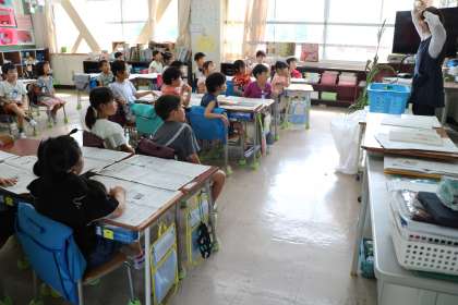 食育の一環としt1年生がトウモロコシの皮むき体験をしました。まずは栄養士さんから「トウモロコシに詳しくなろう」のお話や「トウモロコシクイズ」でトウモロコシについて学びます。