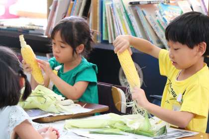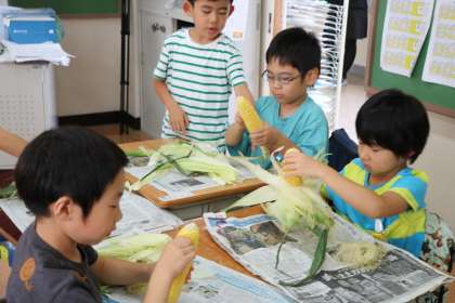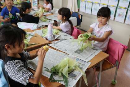 今日の給食で全校児童分提供されます。トウモロコシの数140本近くです。