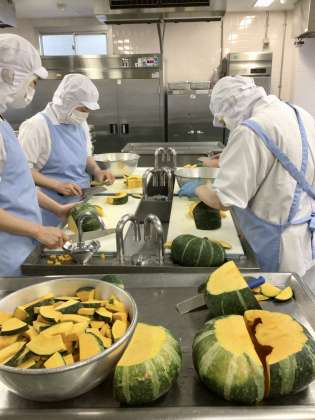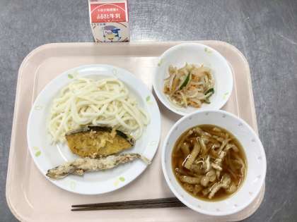 給食は季節に合わせて献立をたてています。夏場のうどんはゆでた後、給食室で冷やすつけめんで提供しています。今日のつけめんはつゆに油揚げをたっぷりつかった「きつねつけうどん」です。かぼちゃの天ぷらは丸ごとのかぼちゃから、砧小全員分とれるように数えながら切りました。甘くてほくほくのかぼちゃの天ぷらができました。栄養を考えてししゃものから揚げ、サラダもついています。栄養満点の夏メニューです。