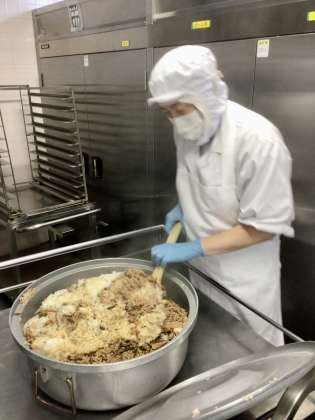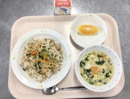 韓国の料理で「ビビン」は混ぜる、「バ」はごはんという意味です。ぜんまい、ひき肉、たけのこを炒めて作った具は先に給食室で混ぜて教室へ提供しています。こどもたちはお皿の上で小松菜、もやし、にんじんで作ったナムルとごはんを混ぜながら食べます。