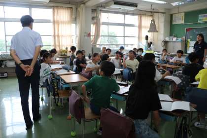 午後の授業が始まる頃、懐かしいお客様が砧小にお見えになりました。高学年の教室へ一学年進級し、成長して頑張っている姿を見ていただきました。子どもたちはびっくりするやら嬉しいやら、嬉しさのあまり泣き出してしまう子までいました。