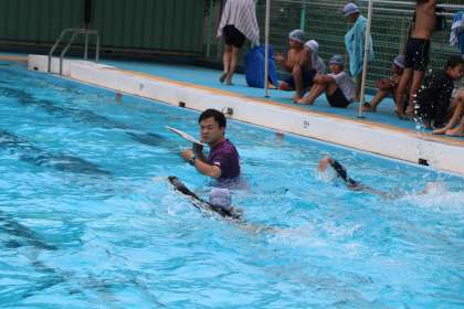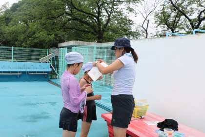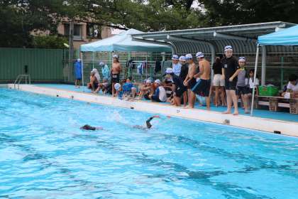 友だちの頑張りに、大きな応援の声が飛んでいます。先生も水中で泳法など確認しながら声援を送ります。