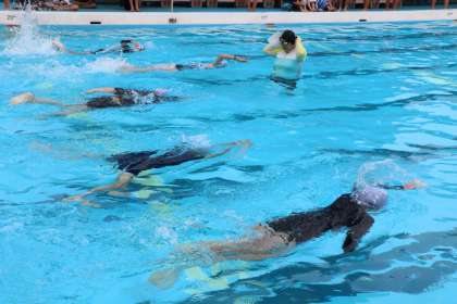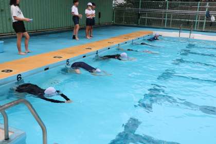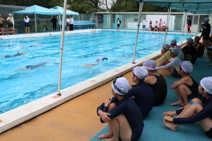 プールサイドからの友達の応援が力になります。