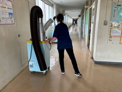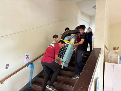 今年の夏祭りは2階教室も使うので、先生たちと準備です。3階からスポットクーラーを運び込み少しでも涼しく過ごせるように猛暑対策をしています。