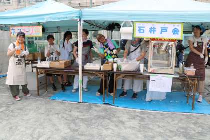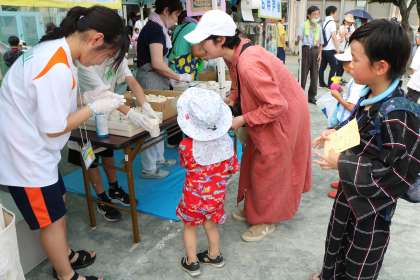 石井戸会様による「ポップコーン」コーナーの様子です。スタンプを押すのは中学生です。