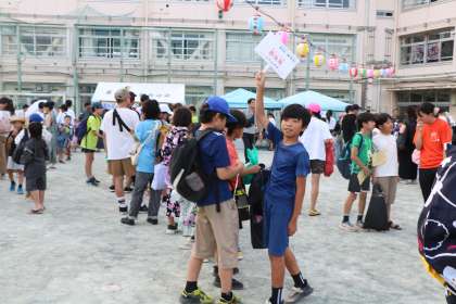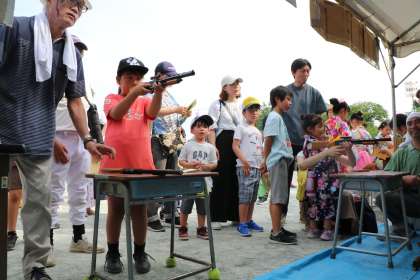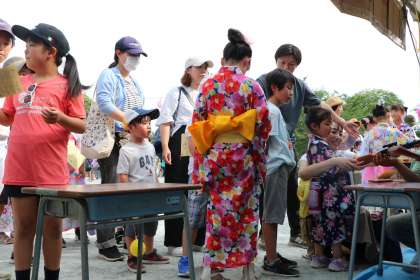 喜多見上部自治会様による「射的」コーナーの様子です。このコーナーも大人気で、最後尾の5年生は「最後尾」カードを持つ手伝いもしてくれています。