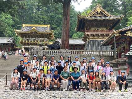 写真は東照宮でのクラス写真です。後ろが陽明門、写真には写っていませんが、子どもたちは正面の3猿を見ています。