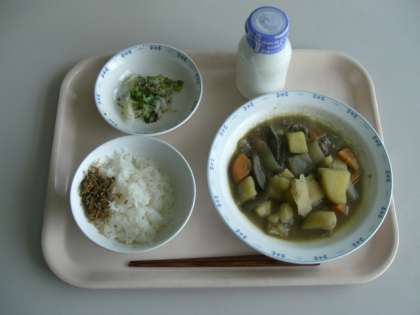 ごはん かみかみ佃煮 五目うま煮 野菜のゆかりかけ 牛乳