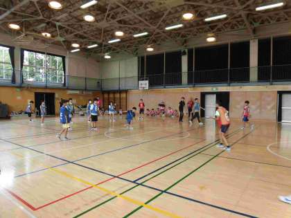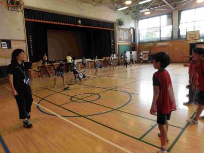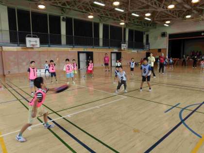 学年で混ざって、ドッジビーをしました。ディスクをまっすぐ投げるって難しい・・・!