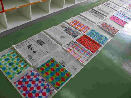 和紙の折り方を工夫して、インクで鮮やかに染めました。