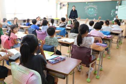 2学期の目標を書いたり、自由研究を並べたりしています。