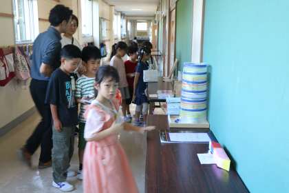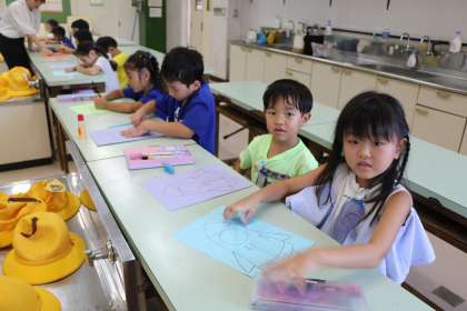 1年生の様子です。1年生は1クラスクーラーの調子が悪く、今日は家庭科室が教室です。