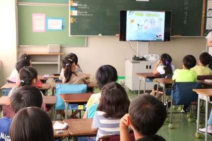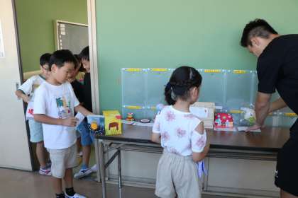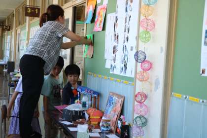 2年生の様子です。夏休みの絵日記発表会をしたり、自由研究の作品を先生と一緒に並べたりしています。