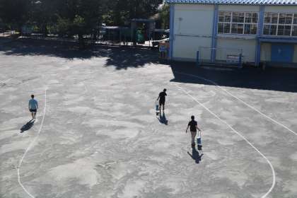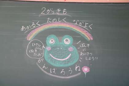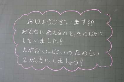 先生たちは今日の始業式を楽しみにしていました。もちろん、長い夏休みたくさんのことに挑戦したのは先生も同じこと、だからちょっぴり夏休みが終わってしまうのが名残惜しいのも子どもたちと同じです。でも、たっぷりエネルギーチャージして、2学期をあれこれイメージして過ごしたので、早く子どもたちと会いたい!楽しみだ!!と思う気持ちの方が数倍大きいことでしょう。そんな先生たちの思いが伝わるような・・・朝早くから校庭にラインを引いたり、教室のクーラーを入れて少しでも子どもたちが快適に過ごせるように掃除したり、準備をして今日を迎えました。黒板のメッセージにも、先生たちの温かい気持ちがあふれています。ほんの一部をご紹介します。