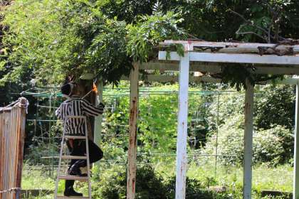 砧小学校自慢の学びの菜園です。主事さんたちが、少しでも畑に日が届くよう、枝を払ったり雑草抜きをしたりしています。涼しくなったとはいえ、外の仕事はまだまだ暑いです。