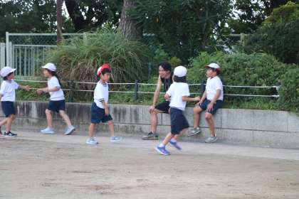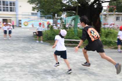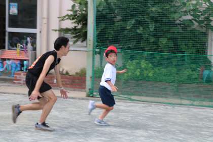 1年生こちらのクラスは先生も一緒にバナナ鬼ごっこを楽しんでいます。先生がラスボス。鬼だそうです。でもみんなのことを追いかけているとへとへとの先生。もう座り込んで動けないようです・・・と思って油断していたら猛スピードで追いかけてきました!たいへん!!