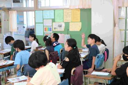 「散らばり」「ドットプロット」「最頻値」など、算数の専門用語を使いながら、データをどのようにまとめるとどのような良さや分かりやすさがあるのか話し合っています。