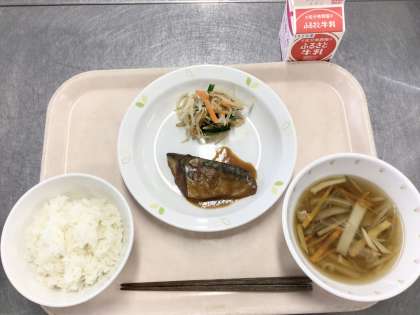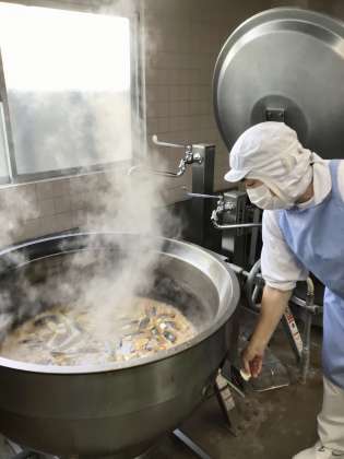 2枚目の写真はさばのみそ煮を作っているところです。給食室の大きな釜で、じっくり時間かけてことこと煮ています。煮くずれないように火加減を微調整しています。