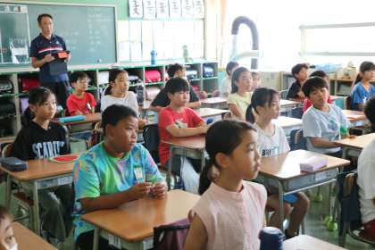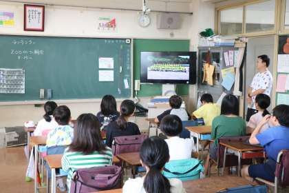 月曜日は朝会の日です。今週は4・5・6年生上学年と1・2・3年生下学年で別れての朝会でした。上学年は教室で放送朝会、下学年は体育館で音楽朝会を実施しました。