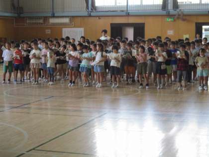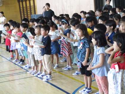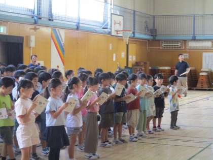 3年生がとっても美しい歌声で、歌う姿勢で、手本となっているので、歌集を見ながら一生懸命歌う1・2年生です。