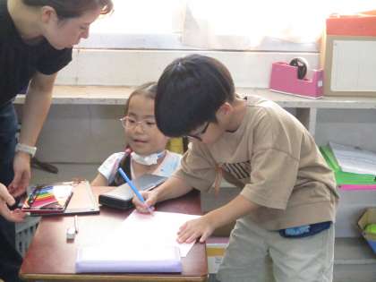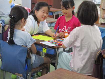 2年生学級活動の時間です。クラスのみんながより楽しくなるように仕事をする係活動の様子です。子どもたちのアイディアあふれる活動なので、係ごと協力してとっても楽しそうです。