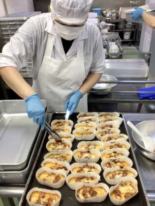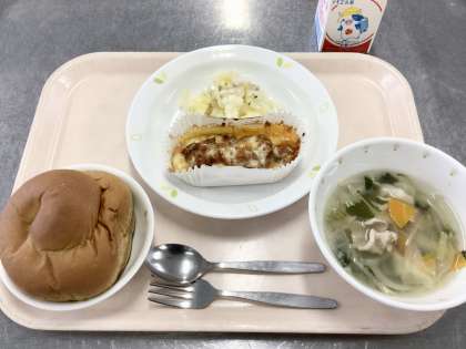 今日の主菜は北海道産の生鮭を使って、手作りの野菜たっぷりのピザソースとチーズをかけて焼いたピザ風を作りました。こどもたちもピザ風の味付けで魚が苦手な子もおいしく食べることができます。
