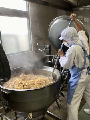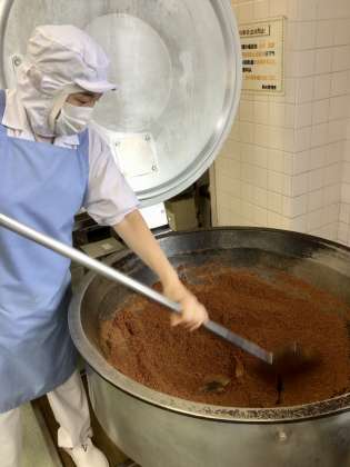 かつおでんぶはとても人気のある手作りのふりかけです。粉かつおぶしとみりん、しょうゆ、さとう、水、ごまのシンプルな材料で作ります。給食調理員さんが約1時間かけてさらさらになるまで炒り続けて作ってくださいました。愛情たっぷりのふりかけです。