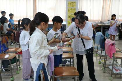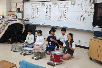 3年生音楽の様子です。石井戸囃子の曲が流れています。リコーダー以外の楽器の体験・練習をしています。