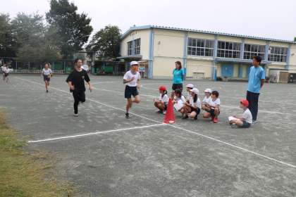 ペアの子が1周ごとの記録を取りながら応援してくれます。伴走する先生も頑張っています。