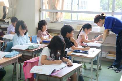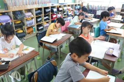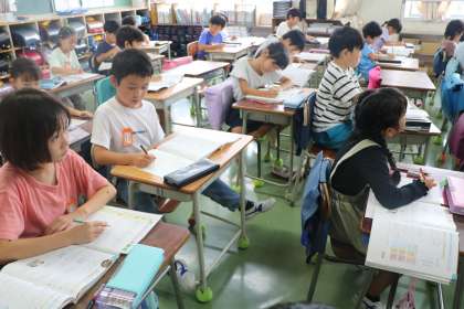 2年生算数、単元学習のまとめの学習をしています。どの子も真剣に問題と向き合っています。