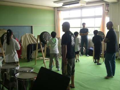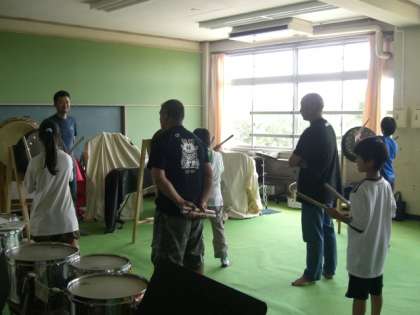 砧っ子夏祭りの盆踊りの時に、太鼓をたたきます。太鼓をたたきたいという希望者に、地域の方や保護者の方が教えてくださいました。