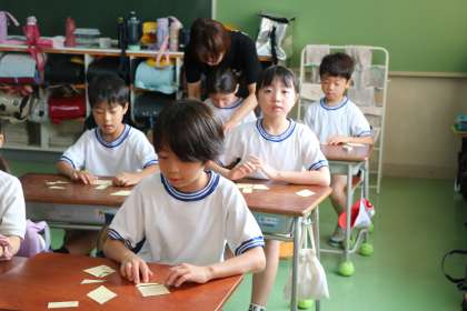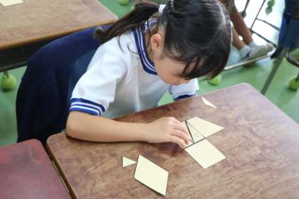 一人ひとり三角形と四角形のタイルをもっていて、先生の出題した形を作ったり、自分で考えた形を作ったりして図形の基本を学んでいます。