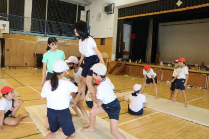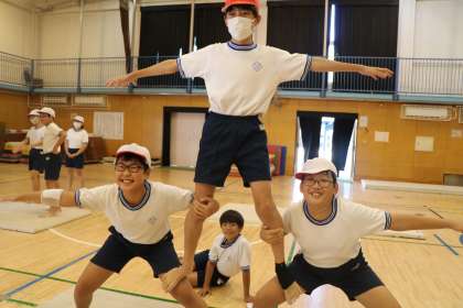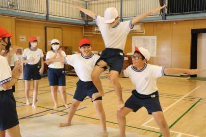 運動会組体操の練習を頑張っています。「もっと腰を落とした方がいいよ」「しっかり手で支えて」とアドバイスをしたり、技ができると互いに拍手をしたり、とっても真剣にみんなでできるようになろう!と取り組んでいます。