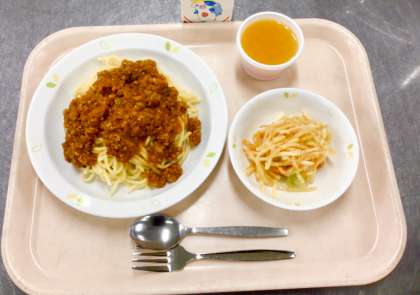 今日は給食試食会でした。たくさんの方にご参加いただきありがとうございました。今日はこどもたちに人気のミートソーススパゲッティ、じゃがいものハニーサラダ、キャロットゼリーでした。試食会では、学校給食についてや、ミートソースの野菜は長時間かけてじっくり炒めていること、じゃがいものハニーサラダのじゃがいもはこれくらい細く切るとおいしいですよ、など調理のポイントもお伝えしました。「こどもが給食が一番おいしいと言っている意味がわかりました。」「こどもが好きな献立が食べられてよかったです。」「とってもおいしくてびっくりしました。」など保護者の方からうれしい感想をいただきました。