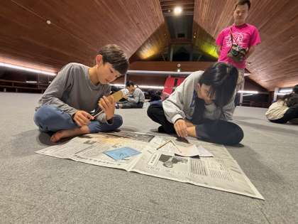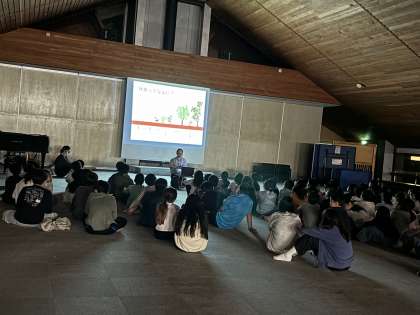 村の会堂.という大広間に集まって林業についての話を聞き勉強したあと、いよいよ箸作りです。