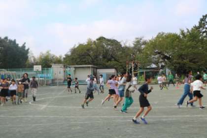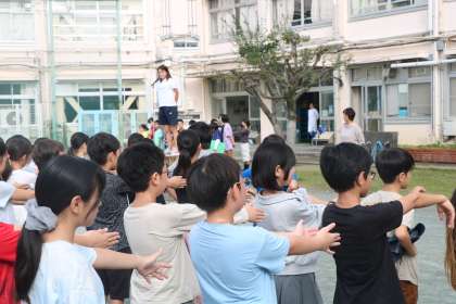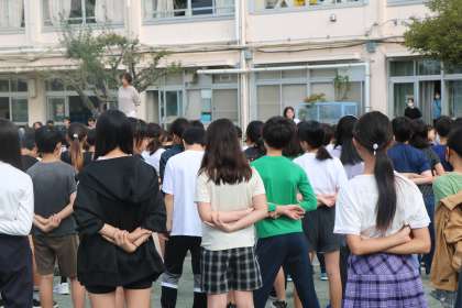 そして全校朝会です。前へならへ・・・の号令がかかっても列があまり動きません。しっかり自分たちで並べているからです。素晴らしい!!