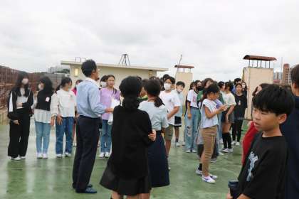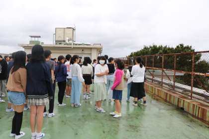 お話の最後に農大の先生と屋上に上がって、校舎周りの景観を見ながらお話を伺いました。国分寺外線をそのまま取り込み、緑豊かな地域のシンボルのような砧小学校を、子どもたちと改めて確認しました。校庭から見える松が、屋上よりもさらに伸びていることにもびっくりしていました。