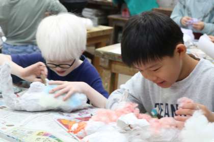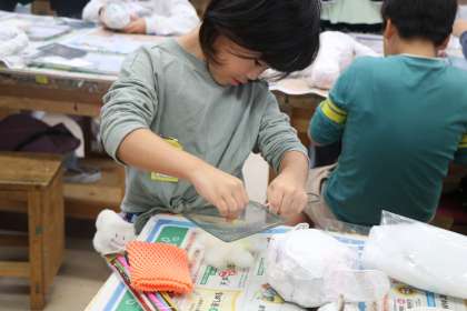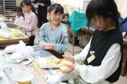 チョークの粉で綿に色を付けます。友だちと仲良く楽しそうです。