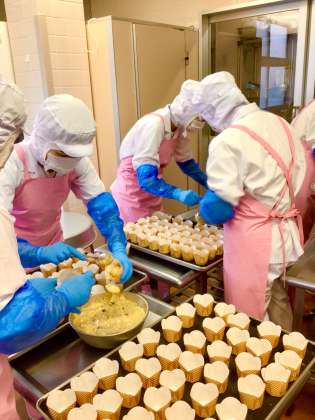 10月10日の目の愛護デーにちなみ、今日の給食では、目に良い食べ物のブルーベリーを使ってマフィンを作りました。ブルーベリーは東京都八王子産のものを使用しています。焼きあがった後には粉糖をかけています。