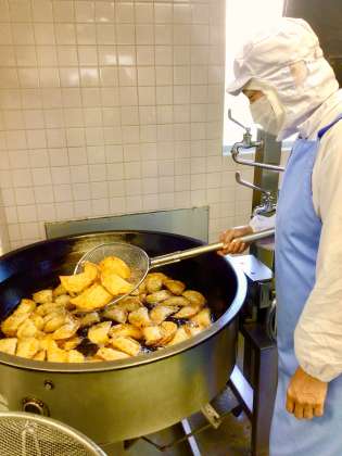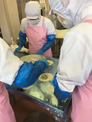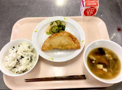 今日の給食は人気ナンバーワンのジャンボ餃子です。皮は特製で直径15センチの大きさがあります。具は低学年、中学年、高学年で量を変えて作っています。