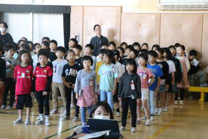 今朝は音楽朝会、初めての試みです。以前月曜日の朝会を1・2・3年生の下学年、4・5・6年生の上学年で別れて実施しました。私が上学年に話をしているときに、下学年は体育館で音楽朝会を、逆に下学年に話をしているときは上学年が音楽朝会をしました。練習する曲は同じですが、歌う旋律が違います。今日は全校で初めて声を合わせてみることに挑戦します。曲は「歌よありがとう」です。