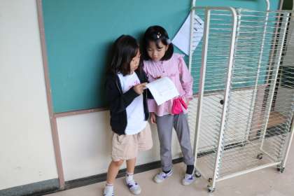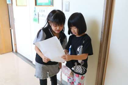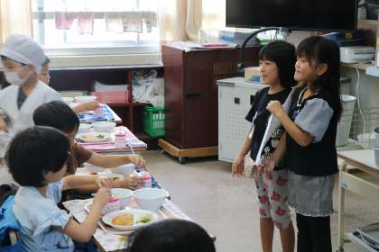 いただきますの前に廊下で給食だよりを読む練習をする日直さん。上手に読めるように頑張っています!