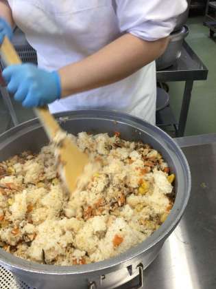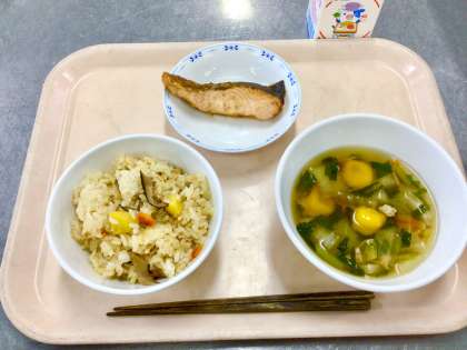 今日の給食は十三夜献立です。十三夜献立として、かぼちゃと白玉粉でつくったお月見団子汁を作りました。秋を感じる吹き寄せごはんには栗も入っています。