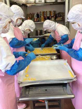 かぼちゃ団子は給食室で全部で2200個、まるめて手作りしました。